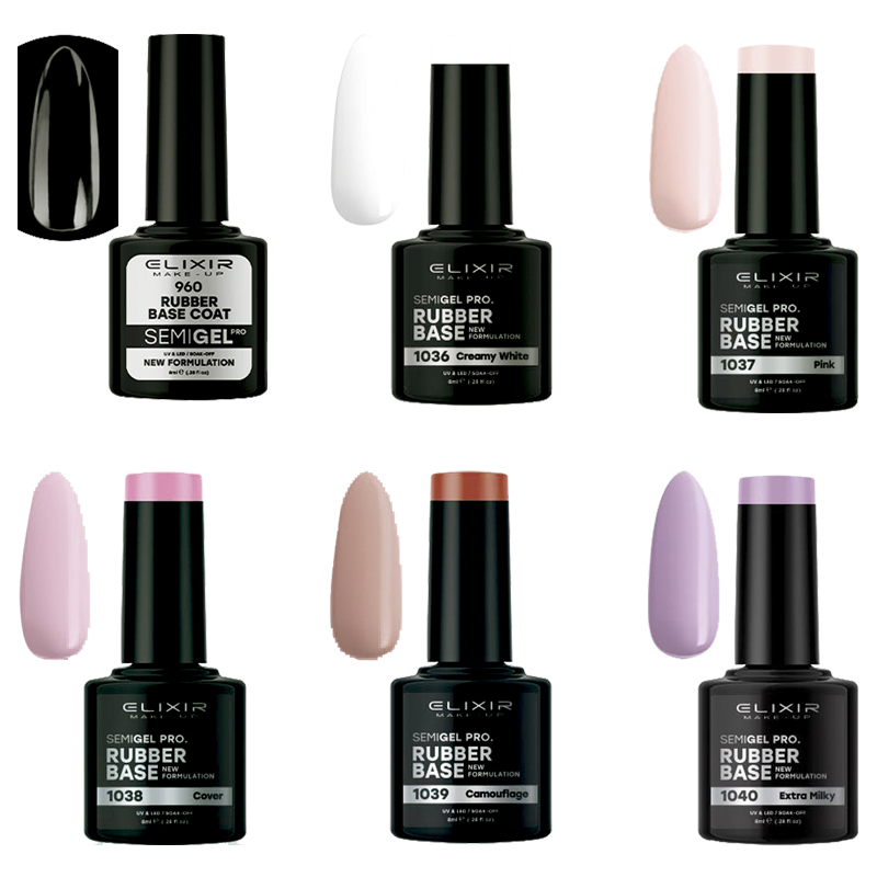 | BASE RUBBER ELIXIR SEMIGEL | 960 RUBBER BASE COAT, 1036 Rubber Base Coat blanco lechoso, 1037 Rubber Base Coat PINK, 1038 RUBBER BASE COAT COVER, 1039 Rubber Base Coat camouflage, 1040 Rubber Base Coat extra milky |
